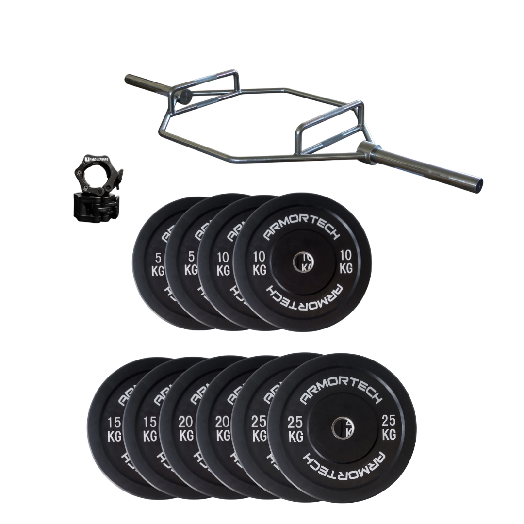 175kg Black Bumper Plate & Hex Trap Barbell Package