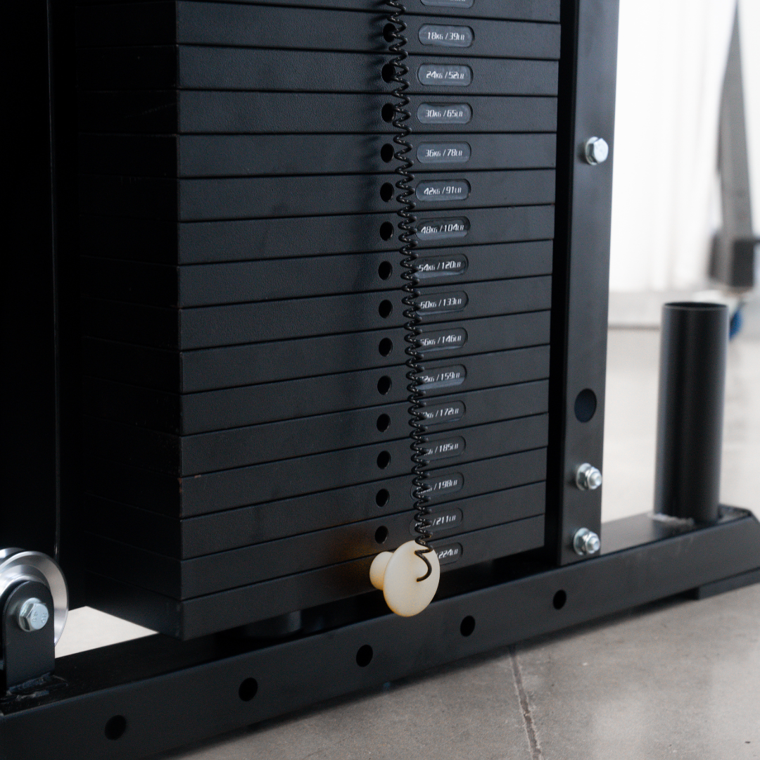 FUNCTIONAL TRAINER COMPONENT The PT100 is a versatile functional trainer equipped with smooth cable pulleys and pin-loaded weight stacks. This combination ensures a smooth and efficient workout experience. You can perform targeted, isolated movements, ideal for building muscle and toning specific areas. With adjustable weight stacks up to 102kg per side, a cable ratio of (2:1 or 1:1), you can easily adjust the resistance to match your fitness level and goals.Includes Ankle Cuff, Seated Row, Tricep Rope, Revolving Straight Bar, Long Curl Bar, Long Straight Bar, 2x d Handle